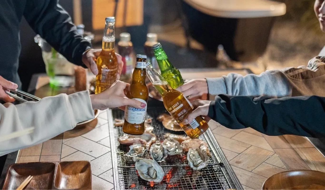- 炭/トング/着火剤/チャッカマン/焼き網/牡蠣用ナイフ/お皿/コップ/お箸のご用意があります。